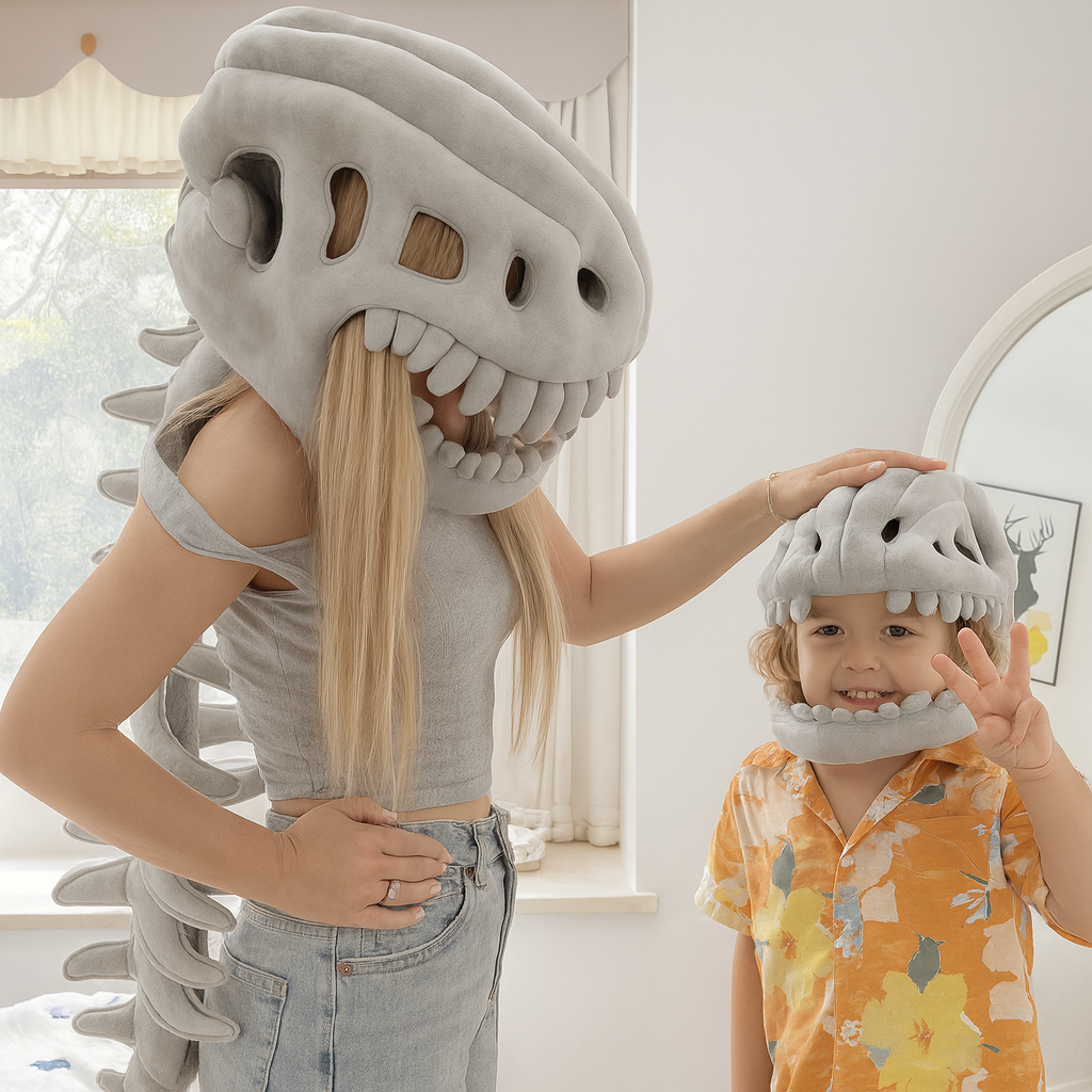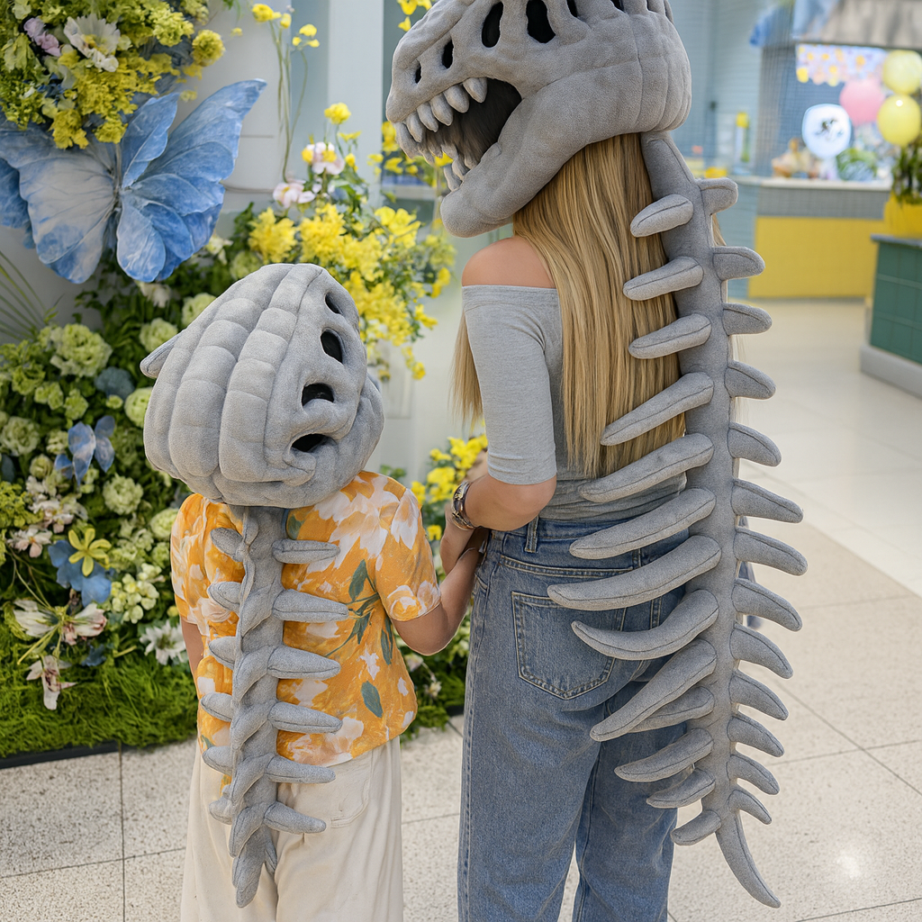 Hem çocuklar hem de ebeveynler için tasarlanan esnek DinoMite peluş tasarım, birlikte dinozor maceraları için kolayca giyilip çıkarılmasını sağlar.